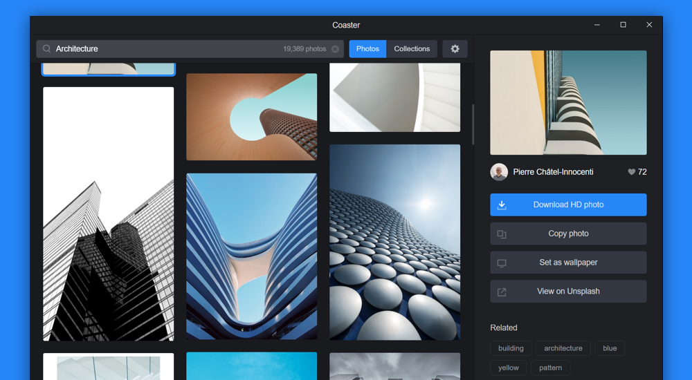 Coaster makes it easier for you to search for photos from the massive library of free stock photos on Unsplash. Download, copy to clipboard, set wallpaper and do more with simpler interface on Windows.